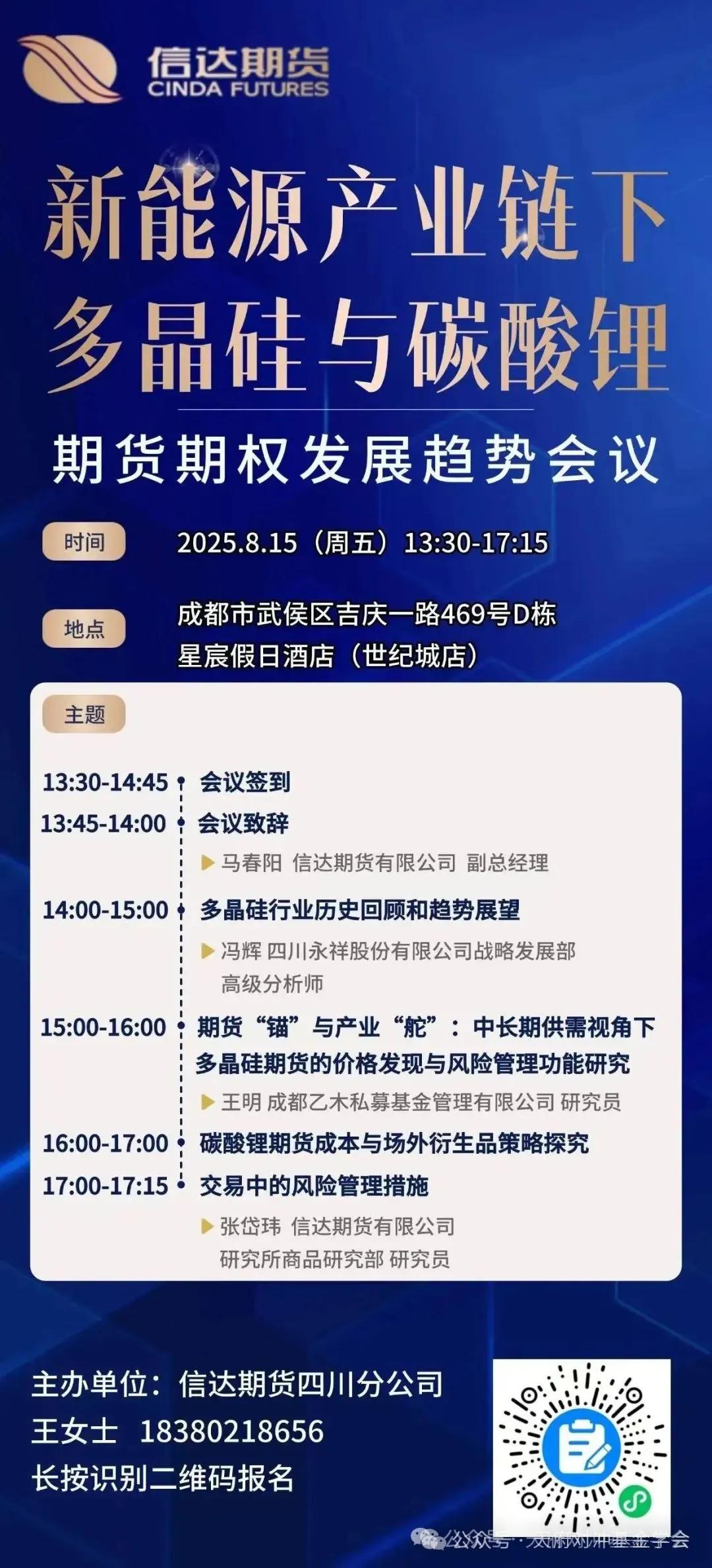 2025年8月15日,在成都武侯区吉庆一路469号D栋星宸假日酒店,由信达期货四川分公司主办的这场“新能源产业链下多晶硅与碳酸锂期货发展趋势会议”,为您提供了一个绝佳的平台:
